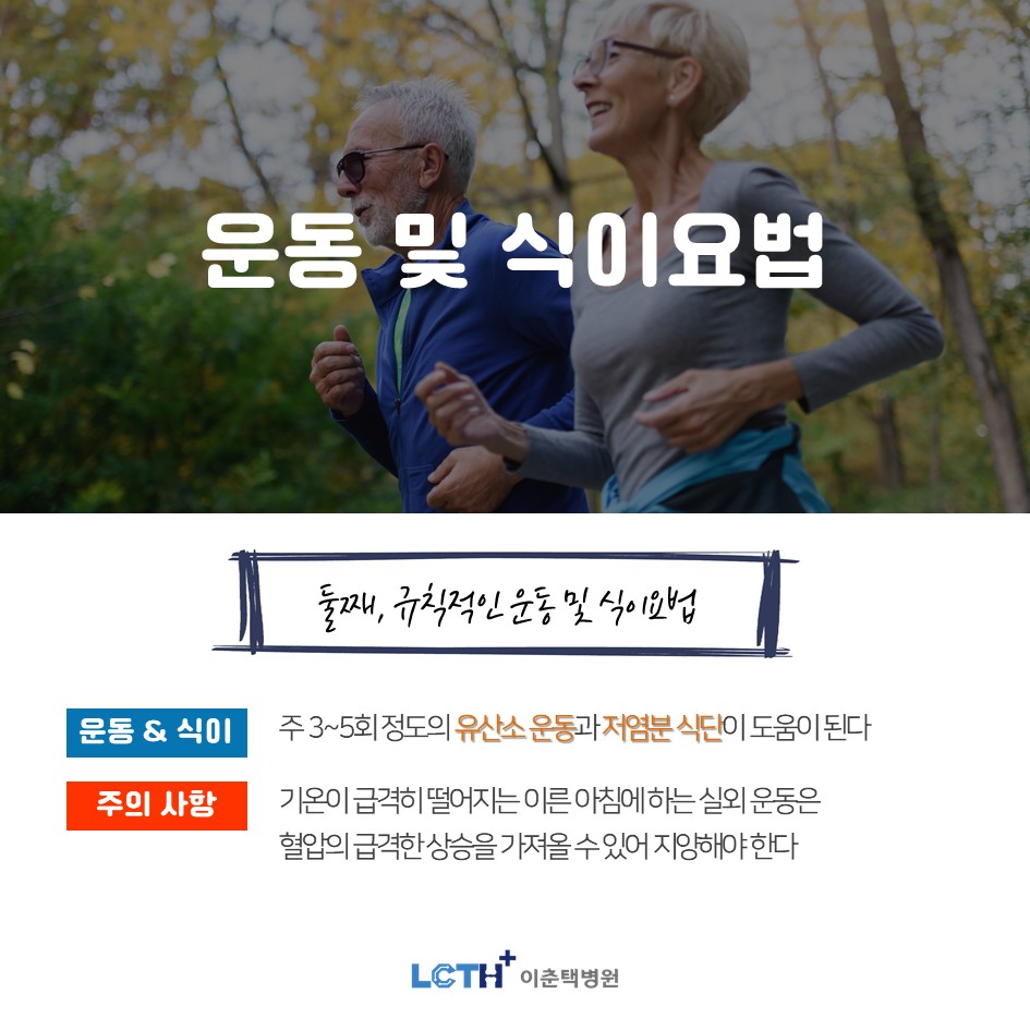 혈압저하를 위한 꾸준한 운동 및 식이요법, 평소 규칙적인 운동과 식이요법도 혈압관리를 위한 좋은 방법입니다. 혈압을 낮추는 운동은 유산소 운동으로 운동 횟수는 주 3회에서 5회 정도가 적당합니다. 적당한 운동은 체중 유지를 도와 혈압 상승을 예방할 수 있습니다. 단, 기온이 급격히 떨어지는 이른 아침에 야외 운동을 하는 것은 혈압을 올릴 수 있으므로 가급적 피하는 것이 좋습니다. 혈압 환자의 식사 요법은 과도한 염분 섭취를 자제하는 것입니다. 소금, 간장, 고추장 등의 장류, 김치, 젓갈, 조미료 버터와 같은 음식 섭취는 최소한으로 하는 것이 좋습니다.