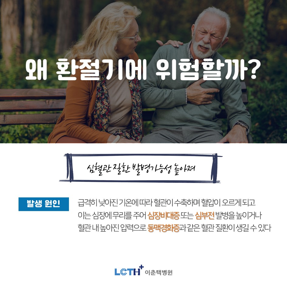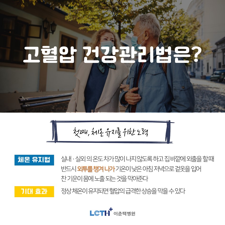 아침 저녁으로 기온이 낮은 환절기에는 갑자기 떨어진 기온에 혈관이 적응하지 못하고 급격히 수축하여 혈압이 높아지고, 그 결과 심혈관 질환의 발병 가능성도 높아집니다. 좁아진 혈관에 피를 보내기 위해 더 큰 압력이 필요해져 심장에 무리가 가 심장 비대증이나 심부전을 일으킬 수 있기 때문입니다. 또한 좁아진 혈관 내의 압력으로 혈관이 두꺼워져 동맥경화증과 같은 혈관질환도 유발될 수 있습니다.고혈압 관리의 세 가지 팁