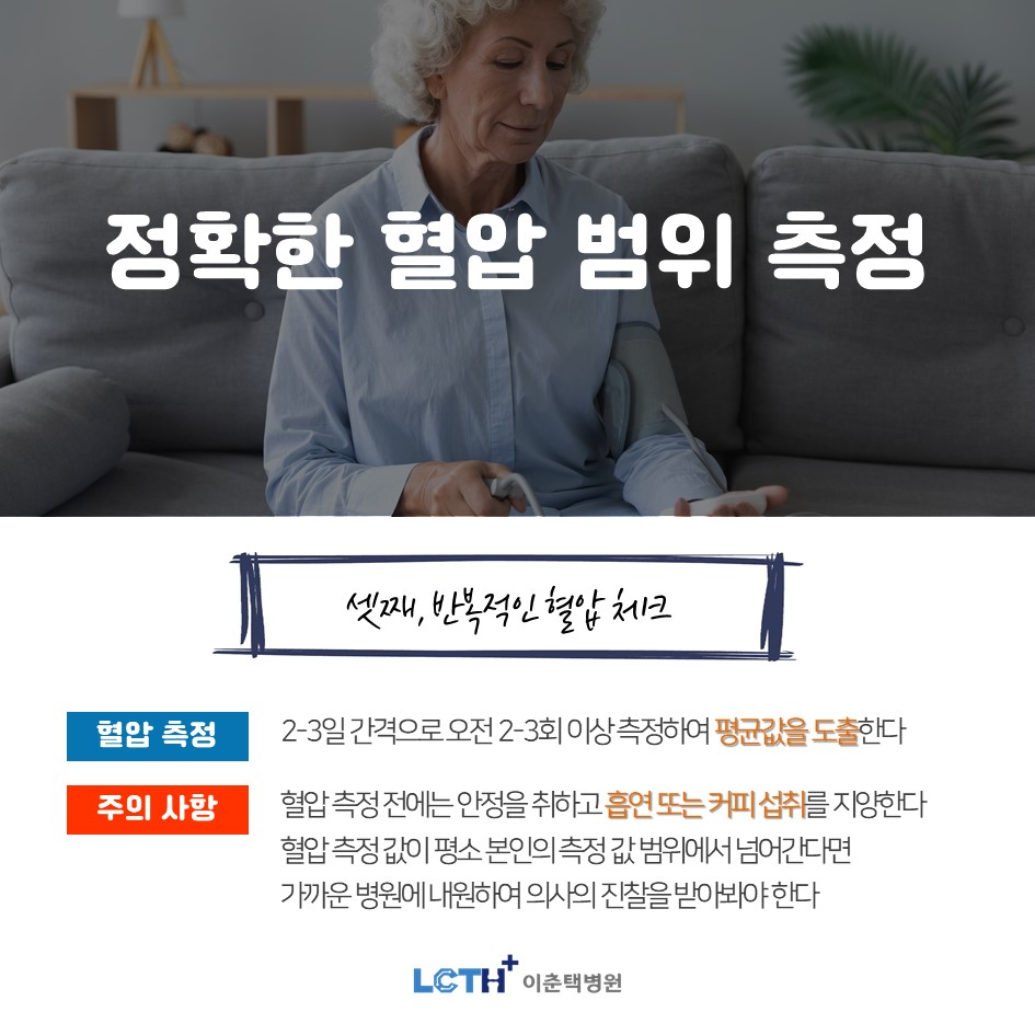 평소의 반복적인 혈압측정을 통한 컨디션 체크도 24시간 혈압 변동폭에는 개인차가 있으므로 병원이나 관공서의 혈압계 또는 가정용 혈압계를 이용하여 평소 본인의 혈압을 반복 체크하는 것이 혈압관리의 시작이라 할 수 있습니다. 왜냐하면본인의혈압변동범위를파악하지못하면정상적인몸상태가없어졌을때바로내몸상태를자각하고올바르게대처할수없기때문입니다. 정확한 혈압 측정은 2~3일 간격으로 오전 2~3회 이상 측정하여 평균치를 도출하는 것입니다. 또한 혈압을 측정하기 전에는 안정을 취하고 흡연이나 커피 섭취는 삼가해 주십시오.