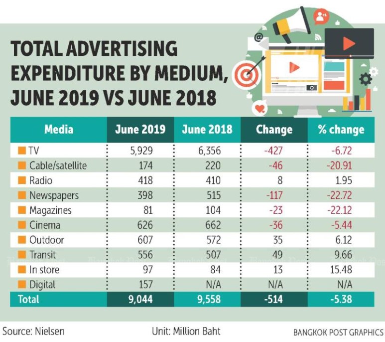 2018년 대비 2019년 6월 현재 미디어를 통한 광고 지출은 TV가 63억5천6백만바트로 전년 대비 6.72% 감소했다. 신문(22.72%)과 잡지(22.12%)는 모두 22% 이상 줄어 디지털미디어의 등장에 따른 인쇄매체의 하락 이유를 적나라하게 보여줬다. 반면 아웃도어 및 인스토어는 증가했다.미디어를 통한 광고비 지출은 전년도에 비해 5.38% 감소했다. < By Harry >