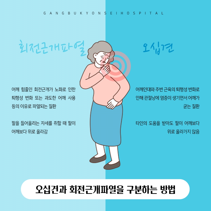 이를 구분해서 진단해야 하는 이유는 오십견과 비슷한 질환으로는 회전근개파열이 있기 때문입니다. 이 역시 50세 이상 연령층에서 퇴행성 변화에 따라 나타나는 현상인데, 최근에는 다양한 스포츠 활동을 즐기는 분들이 외상으로 인한 파열이 나타나고 있습니다. 나타나는 증상도 마찬가지입니다. 삐걱거리는 소리가 동반되거나 어깨가 결리거나 통증이 느껴집니다. 또한 팔을 들수록 불쾌감이 증가하며 누운 자세로는 통증이 더 심해지기도 합니다.