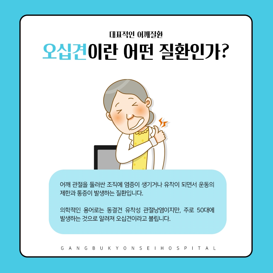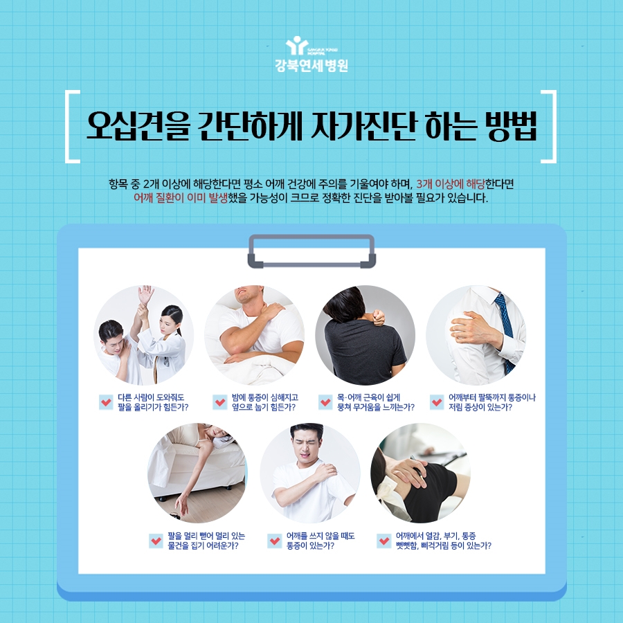 어깨가 부자유스러우면 일상생활에 지장을 줄 수 밖에. 세수조차 스스로 못하는 일이 발생할 수 있는 만큼 평소 근력을 강화할 수 있도록 적당한 운동을 하고 관리하는 것이 중요하며 불편함이 따를 경우 참지 말고 오십견 치료 방법에 대해 고민할 수 있도록 병원을 통해 그에 따른 조치를 받을 수 있도록 해야 합니다. 건강한 어깨가 노후의 행복을 가져오니까 참지 말고 방법을 찾으세요.
