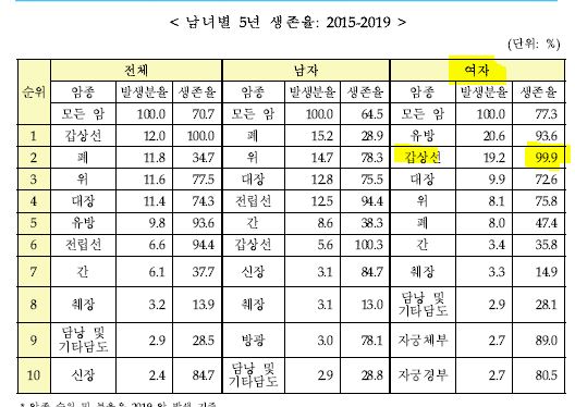 출처 : 2019년 국가 암등록 통계 참고자료 <2021년 12월 29일 발행>에 따르면 15세~64세 여성 암 발생률을 보면 갑상선암이 높은 편인데, 한 가지 다행스러운 점은 갑상선암의 경우 생존율이 99.9% 이상입니다.
