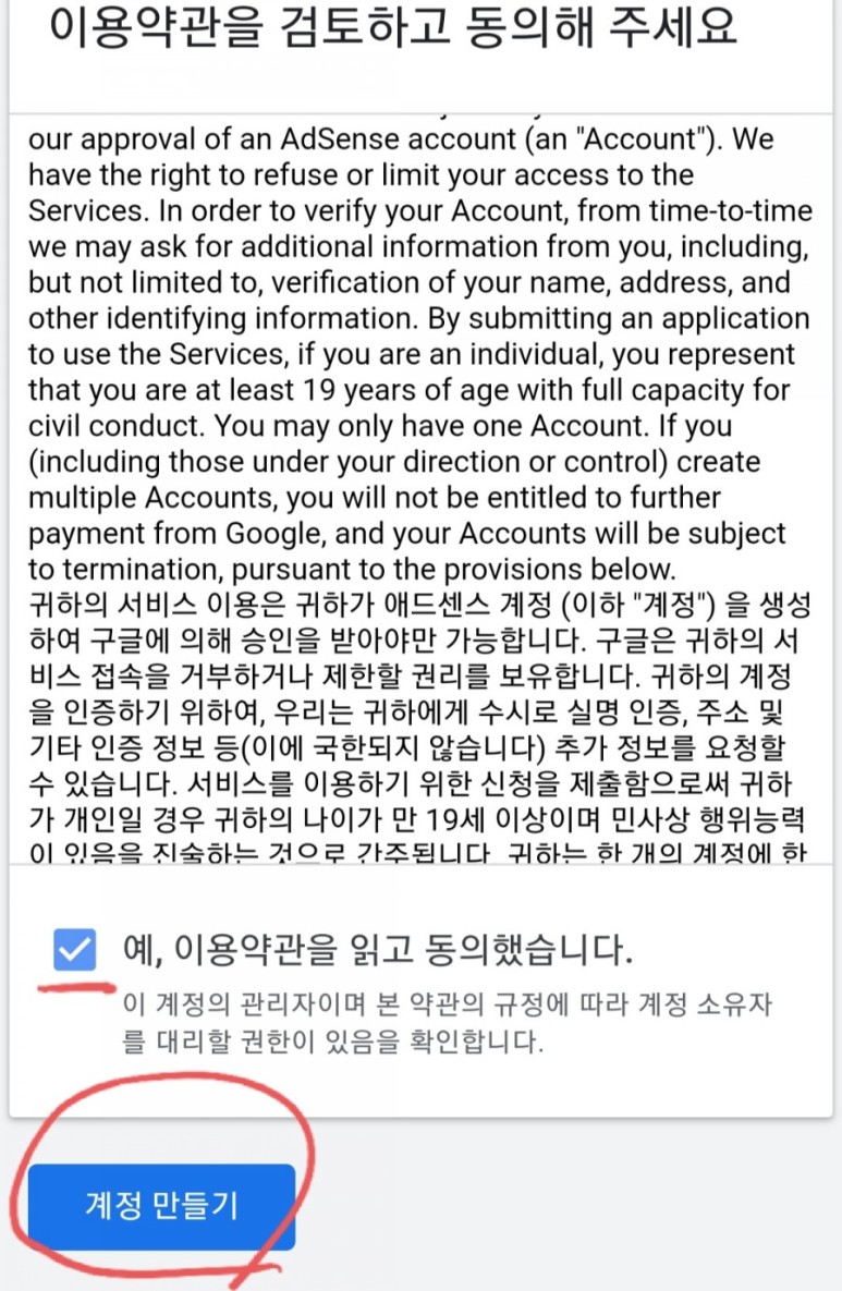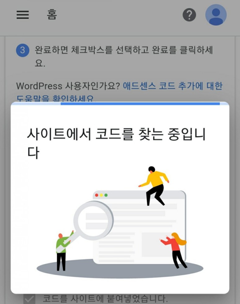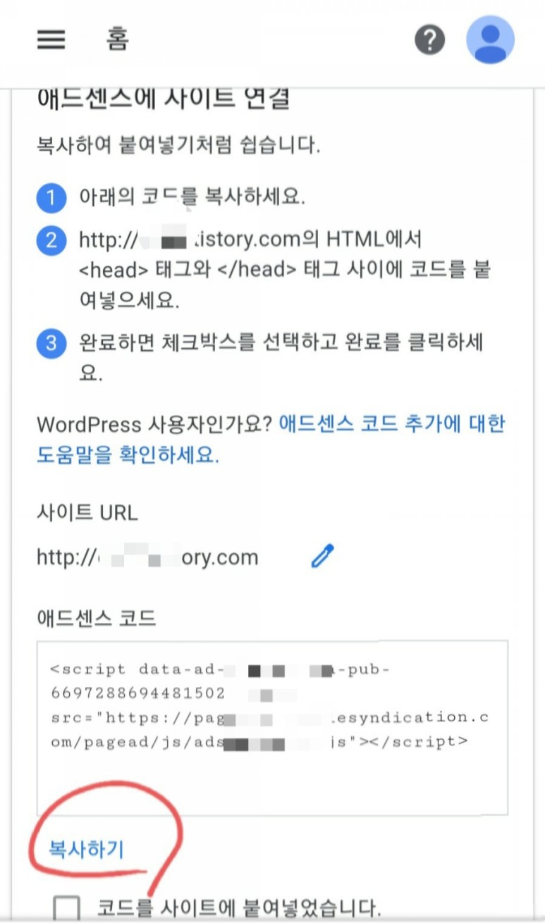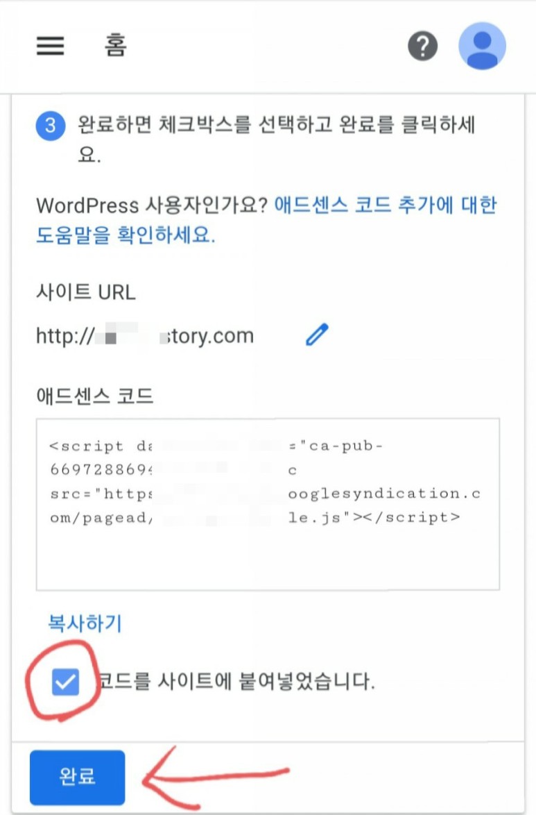 11. 다시 구글 애드센스 등록창으로 돌아가 붙여넣기를 체크하고 완료버튼 클릭!