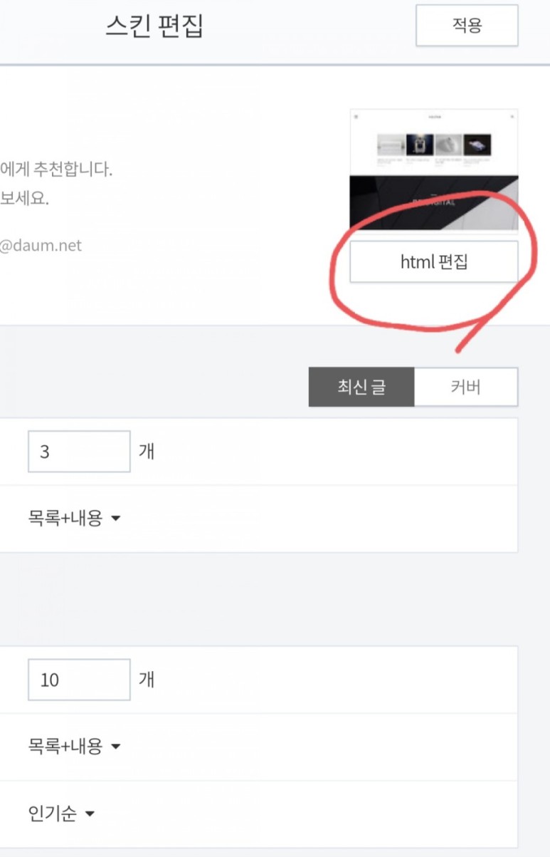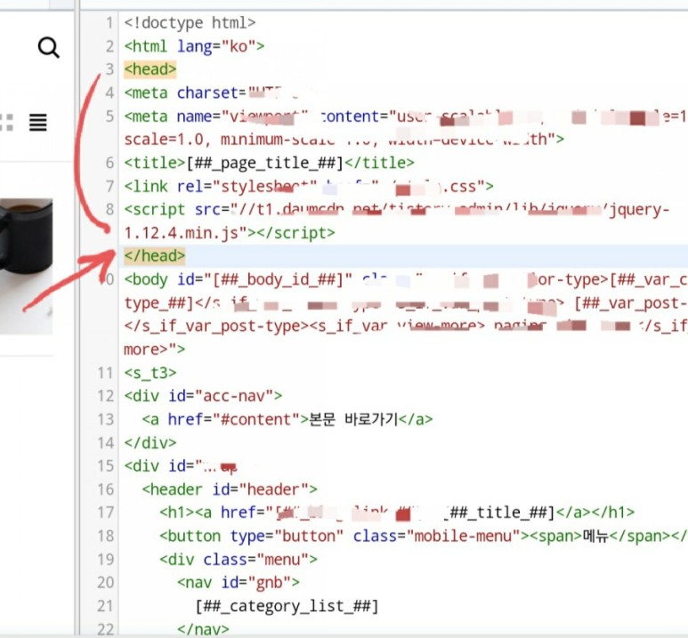 그러면 html 편집창이 뜹니다.<head>와 </head>안에 넣어주세요.저는 </head> 앞에 붙였습니다. head가 눈에 띄지 않으면 컨트롤 +f하여 찾으세요.