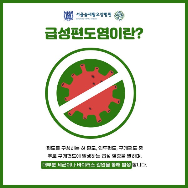 우리 신체조직 중 편도선은 목 안쪽과 코 뒤쪽 림프조직을 말합니다.면역계의 일부로 외부에서 들어오는 세균 등을 방어하는 역할을 합니다.편도선을 구성하는 설편도, 인두편도, 구개편도 중 주로 구개편도에 발생하는 급성 염증을 말하며 대부분 세균이나 바이러스 감염에 의해 발생합니다.◈ 버스이용방법 ◈ 3412 고덕역 하차 340, 342, 3411 고덕평생학습관 하차 ◈ 지하철 이용방법 ◈ 고덕역 하차 3번 출구 도보 7분 상일동역 하차 1번 출구 도보 7분감기와 헷갈리는 급성 편도염 서울숲재활요양병원안녕하세요 서울숲재활요양병원입니다:) 일교차가 커지는 요즘 온도가 급감하여 면역력이 저하되고 바이러스나 세균이 몸에 침투하여 다양한 질환을 유발하고 있습니다. 이때 많은 질환과 건강의 이상 변화를 감기로 착각하여 치료를 미루는 불상사가 빈번하게 발생하고 있습니다.급성 편도염은 감기와 헷갈리기 때문에 많은 환자들이 이 질환의 치료 시기를 놓치는 경우가 많습니다. 따라서 급성 편도염이 무엇인지와 원인과 증상에 대해 잘 알고 대처해야 하며 급성 편도염 예방법을 알고 사전에 예방해야 합니다.