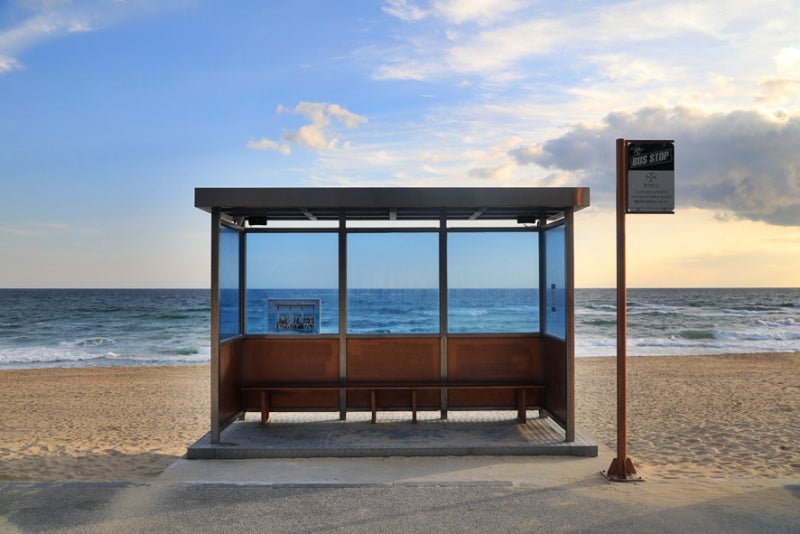 돌아오는 길에 오랜만에 BTS의 봄날을 들으면서 주문진 해수욕장에 왔어요. 내비게이션에 BTS 정거장 치면 나와요! 워낙 유명해서 그런지 내비게이션에 등록되어 있는 게 신기했어요. 정거장 앞에는 주차할 곳이 없기 때문에 해수욕장에 주차하고 조금만 걸으면 정거장이 나옵니다. 멀리서 기다리는 사람들이 보여서 아, 저기가 BTS 정거장이구나 딱 알았어요.