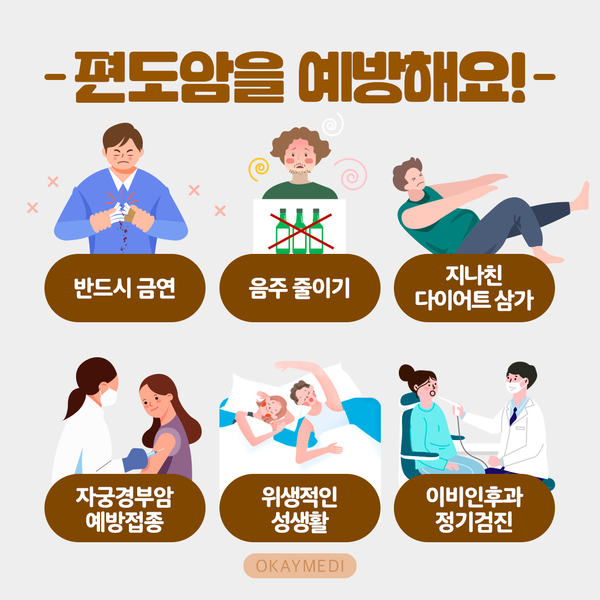✔반드시 금연해주세요.✔ 적당한 음주 습관을 들이세요.✔건전하고 위생적인 성생활을 하는 것이 중요합니다.✔ 너무 많은 다이어트를 하지 마십시오.✔ 자궁경부암 예방접종은 필수입니다.✔ 목에 혹이 있는 것 같으면 빨리 이비인후과 진료를 보는 것이 좋습니다.✔정기적으로 검진을 하는 것이 가장 중요합니다.