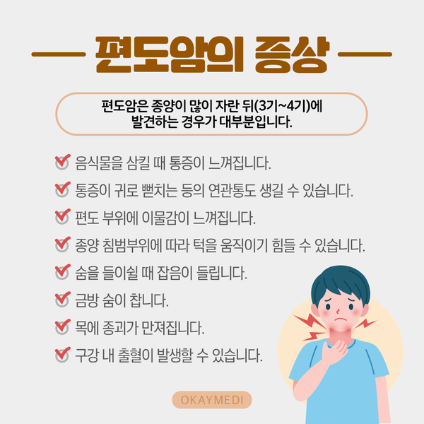 대부분의 암은 초기에는 증상이 잘 안 나타나는데요?편도암도 종양이 커진 후에 (3기~4기) 발견하는 경우가 대부분입니다.- 음식을 삼킬 때 통증을 느낍니다.- 통증이 귀로 뻗치는 등 관련성도 생길 수 있습니다.- 편도 부위에 이물감이 느껴집니다.- 종양 침범 부위에 따라 턱을 움직이기가 어려울 수 있습니다. -숨을 들이마실 때 잡음이 들립니다.금방 숨이 차요.- 목에 종양이 만져져요. – 구강 출혈이 발생할 수 있습니다.