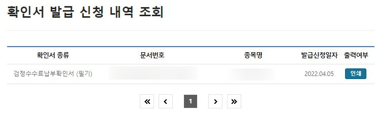 [검정 수수료 납부 확인서 신청 내역 조회]신청내역조회란에 문서번호가 표시되고 우측에 인쇄버튼이 활성화됩니다.