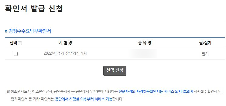[검정 수수료 납부 확인서 신청] 신청하고자 하는 시험을 선택하고 신청 버튼을 클릭합니다.