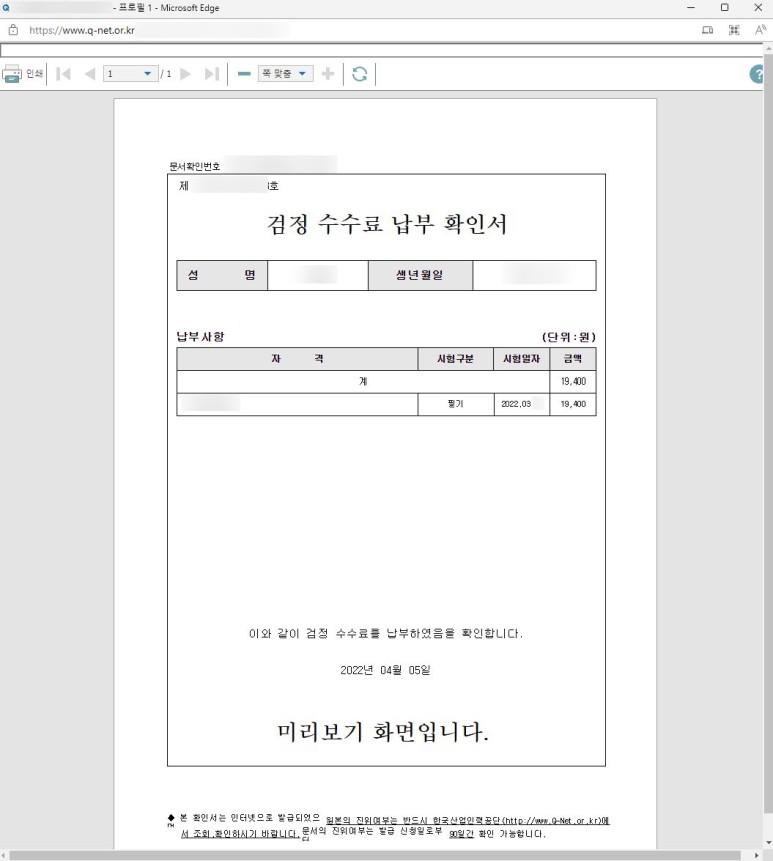 [검정수수료 납부 확인서 출력] 미리보기 화면이 나타나 인쇄가 가능합니다. 미리보기 화면은 증명 효력이 없으니 출력해서 제출하세요!