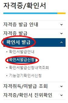 [자격증/확인서] 상단 중앙 메뉴에 자격증/확인서 클릭!