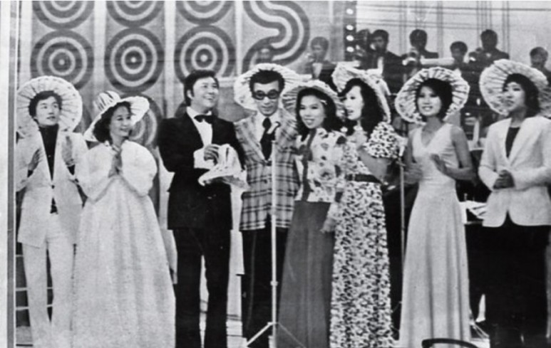 1974년 쇼프로그램에 함께 출연했던 박춘석과 당대 톱스타들. 왼쪽부터 김상진 황금심 남진 박춘석 이미자 하충화 문주란 임희숙.
