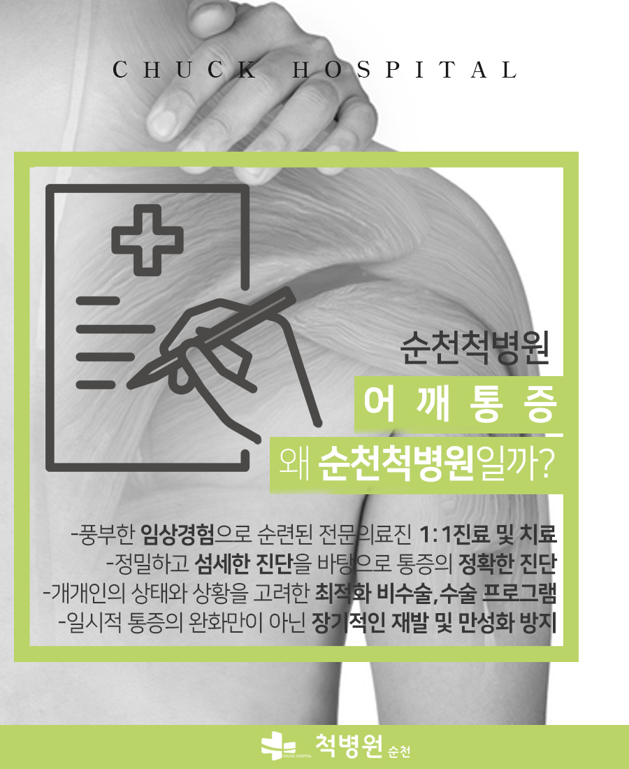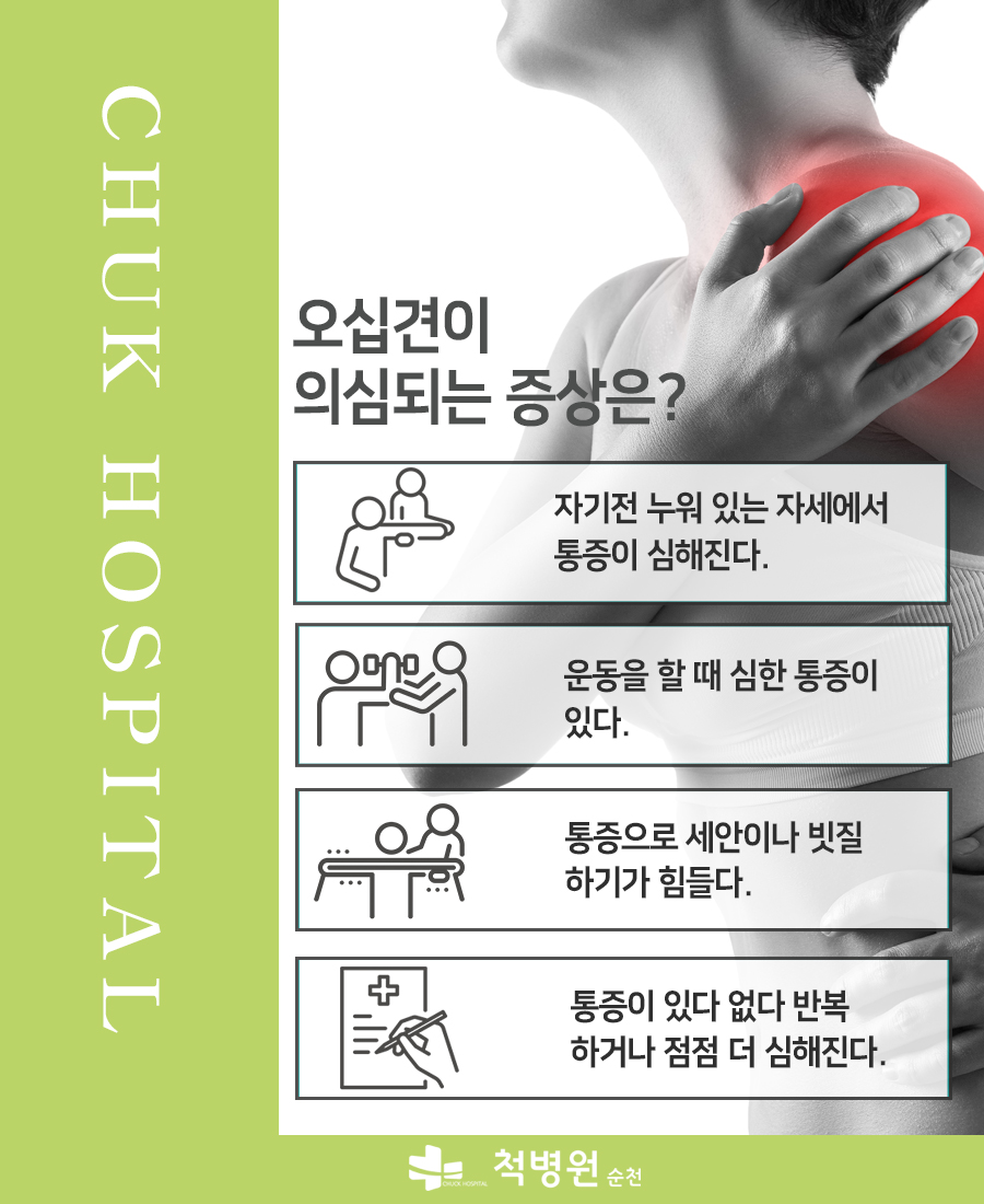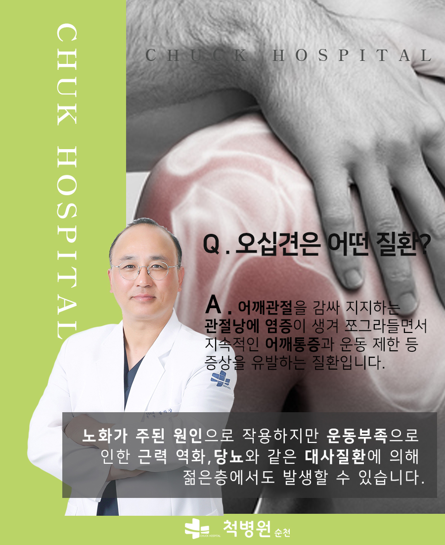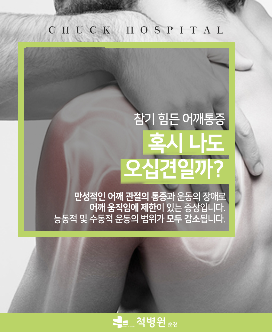 순천오십견치료 순천척병원은 “흔히 오십견과 혼동되는 경우가 많은데 오십견은 어깨 관절이 딱딱해 어느 방향이나 각도에서 팔을 움직이기 쉽지 않다”며 “반면 회전근개 파열은 통증이 있어도 어느 각도까지는 팔을 들어올릴 수 있어 특히 특정 각도에서 통증이 발생하는 것이 특징”이라고 설명했습니다.