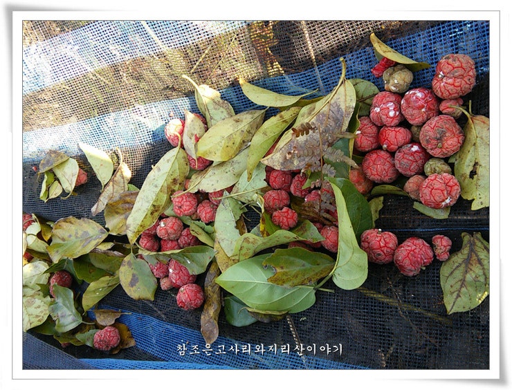9월에 붉은색으로 익는데 작은 열매가 모여 덩어리가 되고 그 크기는 지름이 2~3cm 둥근 모양으로 호두와 비슷합니다.