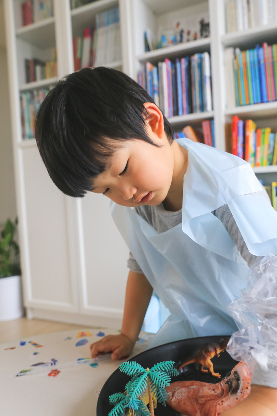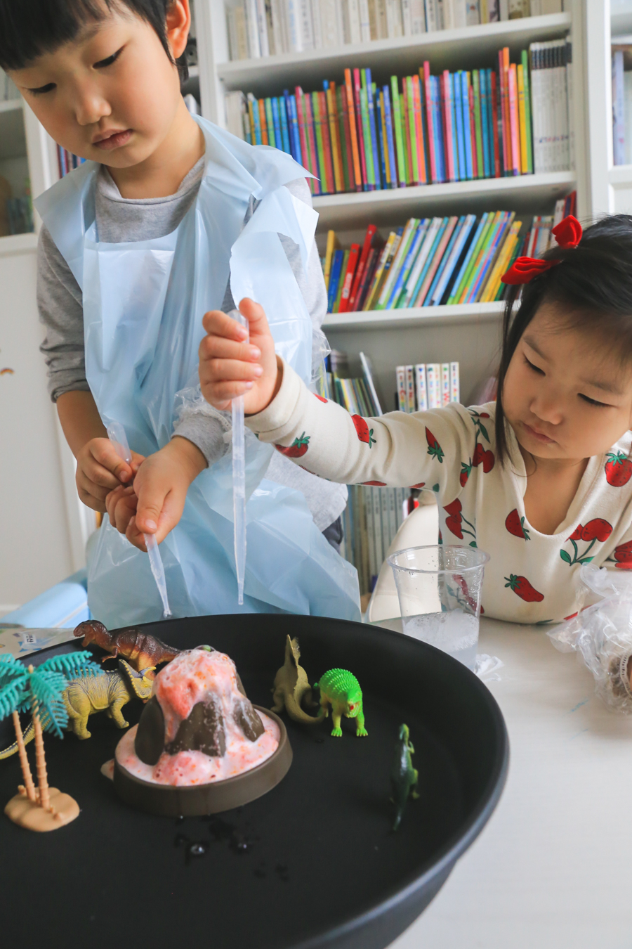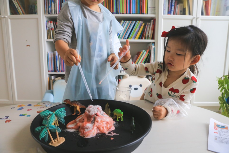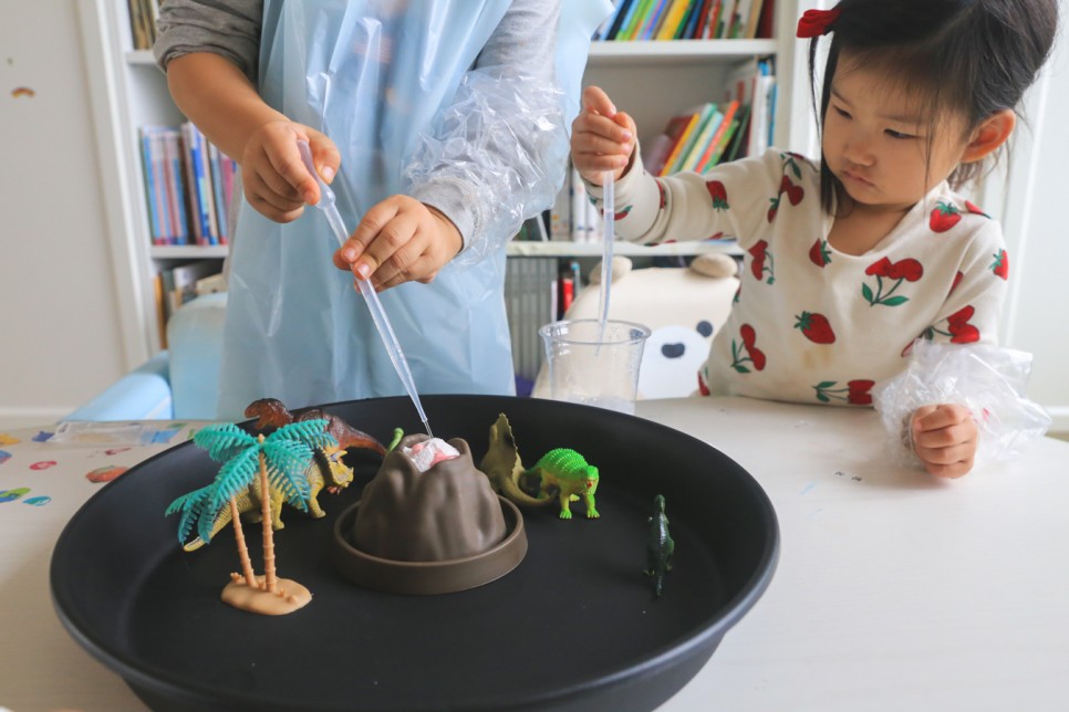 용암이 화산 너머로 쏟아져 나와도 놀이터 그대로 씻으면 되니까 뒷정리도 간단! 투명한 팔토시와 앞치마도 있고 아이들의 옷도 더러워지지 않고 아이들도 즐겁게 놀면서 엄마도 편한 시간이었습니다.