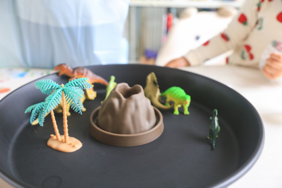 화산폭발 놀이를 좀 더 재밌게 하기 위해서 간단하게 스몰월드를 만들어 봤습니다 중앙에 화산을 배치하고 나무도 2그루. 평화롭게 사는 공룡 친구도 넣어줬어요