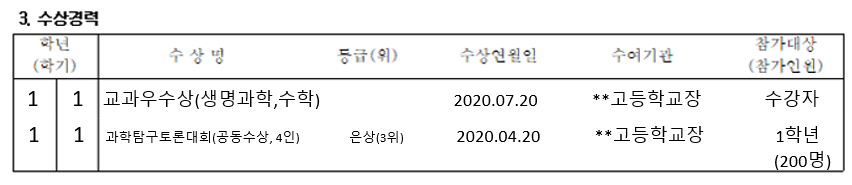 이것은 일반 학교에 다니는 학생에게는 적용되지 않기 때문에, 더 자세하게는 쓰지 않아요.열심히 노력해서 수상한 만큼 수상 경력에 오류가 없는지 잘 확인하길 바란다.