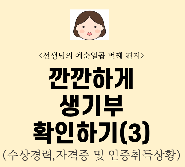 선생님의 60번째 편지 To. 수 상 경력 입력 기준이 궁금해 너 수상 경력에는 어떤 상이 기록될까 궁금해 너에게 생기부 수상 경력에 대해 알려주려고 해. 수상 경력을 보는 김에 다음 항목인 자격증 및 인증 취득 상황도 함께 살펴보자. (1) 수상 경력 입력 기준 (1)-1. 수상 경력에는 교내상만 입력할 수 있다.