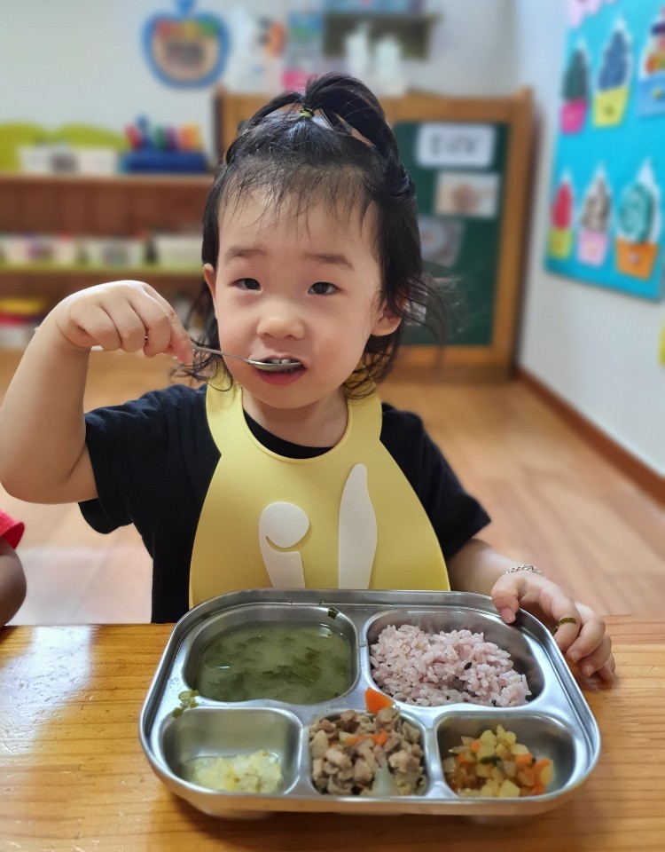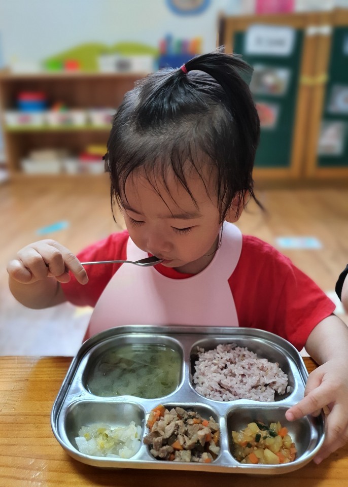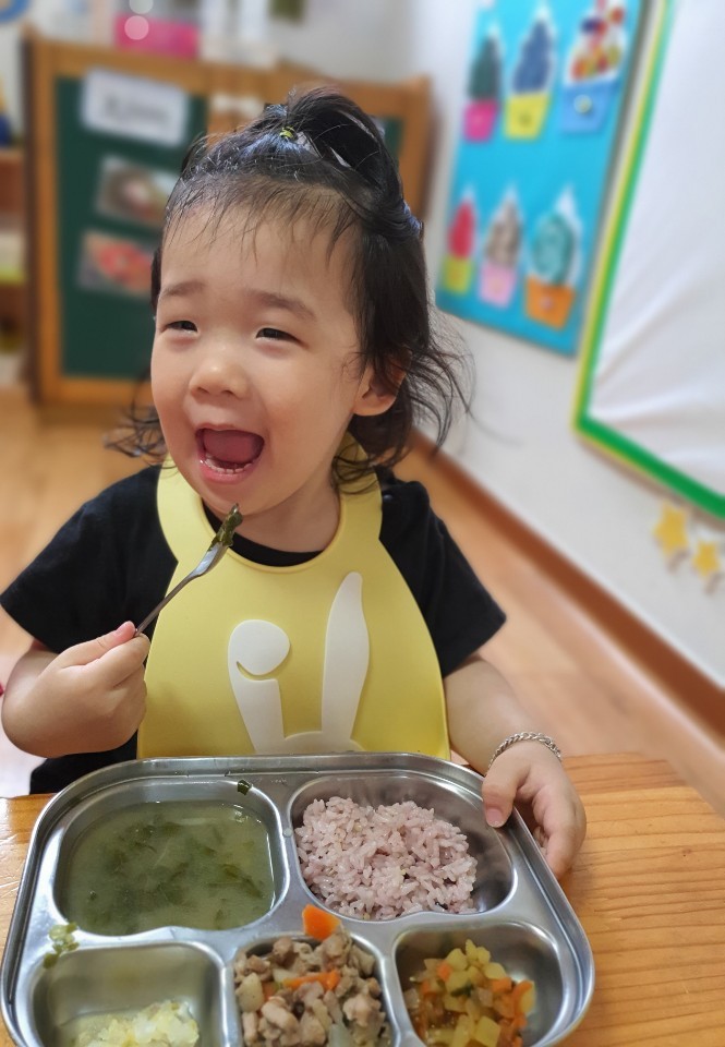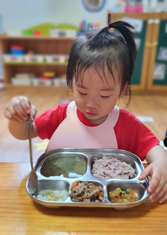 어린이집 점심시간에 담임선생님이 사진을 찍어서 어린이집 밴드에 올려주셨는데 사진을 봤을 때는 잘 먹는 것 같은데 많이 안 먹었다고 합니다.