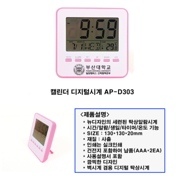 디스플레이는 각도나 조명에 의해 어둡고 불투명해 보이거나 밝고 투명해 보이기도 합니다.온습도나 날씨는 나쁠 때도 있고 정확하지 않은 것 같습니다.그래도 날짜, 요일, 시간(오전과 오후의 표시) 기능만으로 저는 충분히 유효하게 사용하고 있습니다.온습도나 날씨는 나쁠 때도 있고 정확하지 않은 것 같습니다.그래도 날짜, 요일, 시간(오전과 오후의 표시) 기능만으로 저는 충분히 유효하게 사용하고 있습니다.인쇄 / 판촉물 제작레이저인쇄(그레이로표현됨)도가능하고UV컬러인쇄도가능합니다.로고나 이벤트명을 넣어 판촉물을 제작할 수 있습니다.학교나 학원, 그리고 기업에도 추천합니다.스마트폰이 있는데 시계가 필요한가 싶을 수도 있지만 일정관리, 시간관리가 중요한 사람에게는 고개를 들고 직관적으로 바로 확인할 수 있는 기계가 편하니까요.기본 패키지 (패키지 디자인은 변경될 수 있습니다.)- 디지털 탁상시계 판촉물 제작 – 기본주문수량은 100개이나 그 미만의 수량도 제작가능합니다.제작기간은 레이저 인쇄로 약 3일, UV 컬러 인쇄로 약 5일입니다.- 디지털 탁상시계 판촉물 제작 – 기본주문수량은 100개이나 그 미만의 수량도 제작가능합니다.제작기간은 레이저 인쇄로 약 3일, UV 컬러 인쇄로 약 5일입니다.- 디지털 탁상시계 판촉물 제작 – 기본주문수량은 100개이나 그 미만의 수량도 제작가능합니다.제작기간은 레이저 인쇄로 약 3일, UV 컬러 인쇄로 약 5일입니다.