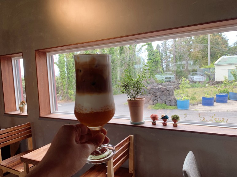 제주도 가수 해바라기 난 까페 메뉴 추천 시골 뷰와 음악에 반했는데 귤과 우유 크림 커피 네 겹으로 구성되어 빨대를 똑바로 꽂아 마시고 섞어 마시면 최고의 감귤 비앙코라떼 귤과 라떼가 이렇게 어우러질까!?