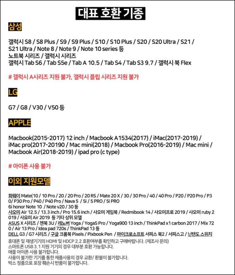 대표 호환 기종 꼭 확인 부탁드립니다^ ^ ‘룩스핏 C타입 HDMI 미러링 케이블’은 삼성, LG 등에서 출시한 대부분의 스마트폰, 태블릿 PC 제품과 호환되는 점이 좋았지만 갤럭시A 시리즈나 갤럭시 플립 시리즈, 아이폰에는 사용이 불가하다고 하니 꼭 확인 부탁드립니다. 그리고 그런 일은 없겠지만 USB 3.1C 커넥터 제품이므로 마이크로 5핀 단자 커넥터를 사용하는 구형 스마트폰이나 태블릿PC에서는 사용할 수 없습니다.^^