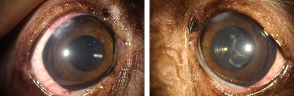 수술 후 2주차 이후 안과 현미경 검사를 통해 경과를 확인했을 때 왼쪽 눈은 아직 수술 후 염증이 남아 있었기 때문에 하얗게 염증 물질을 확인할 수 있었지만, 두 눈의 동공 내에 하얗게 되어 있던 백내장이 없어진 것을 확인할 수 있었습니다. 동공 안에 보이는 동심원은 인공 렌즈로 안정적으로 위치하고 있는 것을 확인할 수 있습니다.