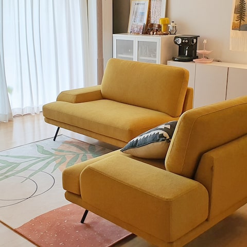 이제 본격적으로 저희 집에 들어갈 수 있는 소파가 있는지 구경을 시작했는데요.처음 본 건 이 카멜 계열 소파였어요.평소 카멜컬러가 좀 촌스럽고 올드하다고 생각했는데 디자인 때문인지 앞에 있는 테이블이라서 그런지 고급스러워 보였어요.
