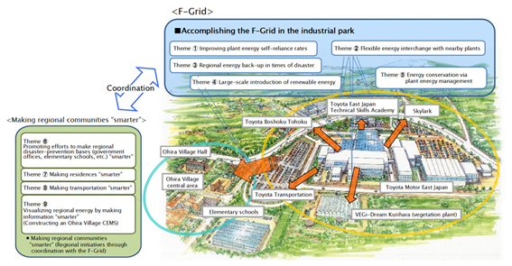 F 그리드의 개요도. 토요타 공장을 중심으로 농업 시설과 주거 지구가 조합된 마이크로 그리드 시스템입니다. ©TOYOTA