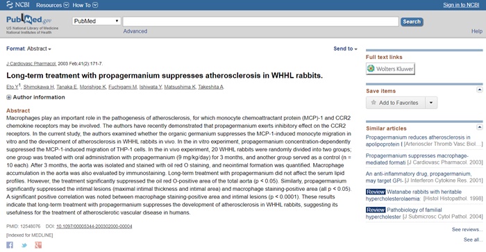 [ 유기게르마늄의 아테롬성 동맥 경화증 억제 효과와 관련된 논문 ]Format : Abstract Send to J Cardiovasc Pharmacol . 2003 Feb ; 41 ( 2 ) : 171 – 7 . Long – term treatment with propagermanium suppresses atherosclerosis in WHHL rabbits . Eto Y 1 , Shimokawa H , Tanaka E , Morishige K , Fuchigami M , Ishiwata Y , Matsushima K , Takeshita A . Author information Abstract Macrophages … www.ncbi.nlm.nih.gov