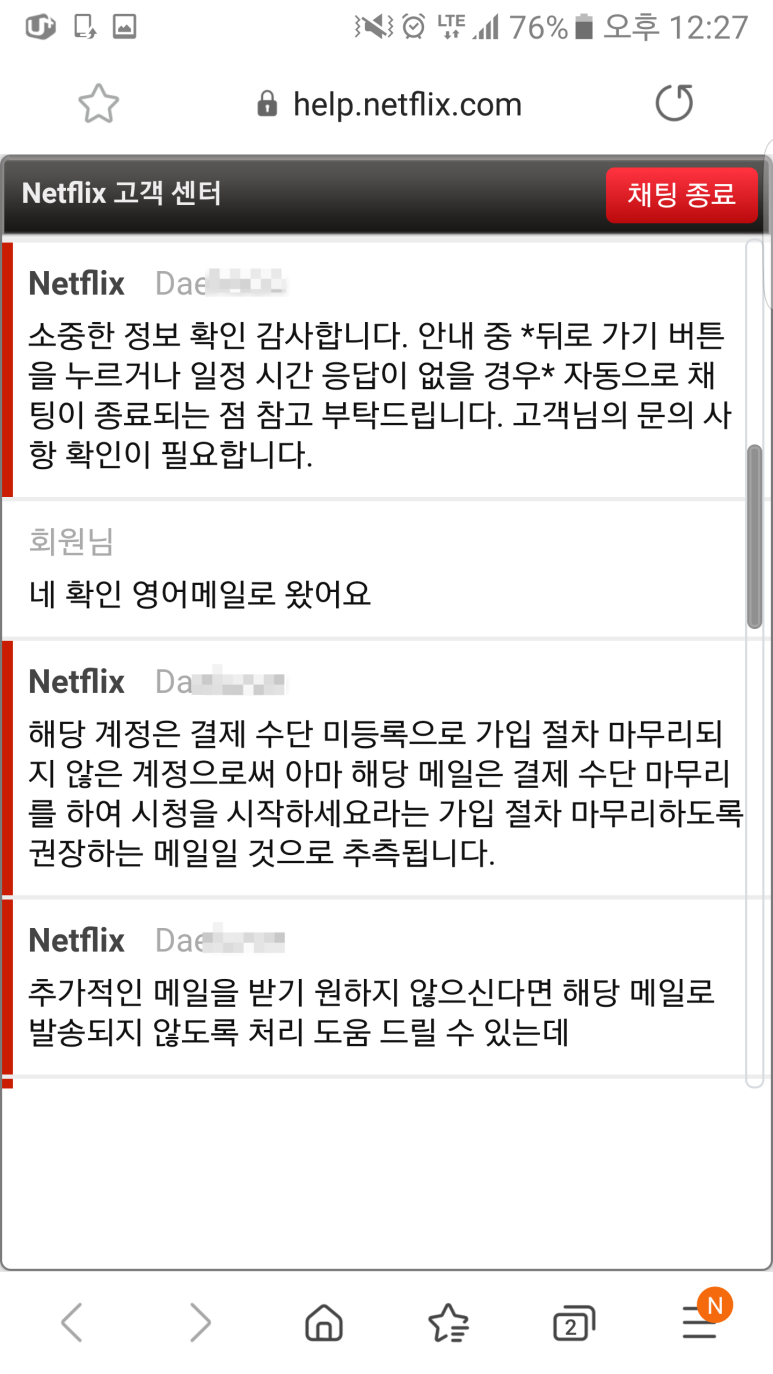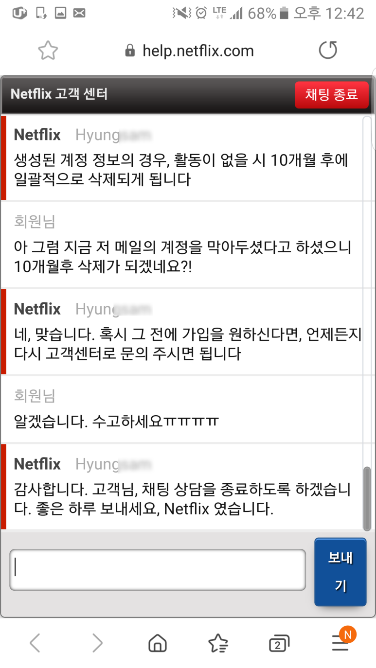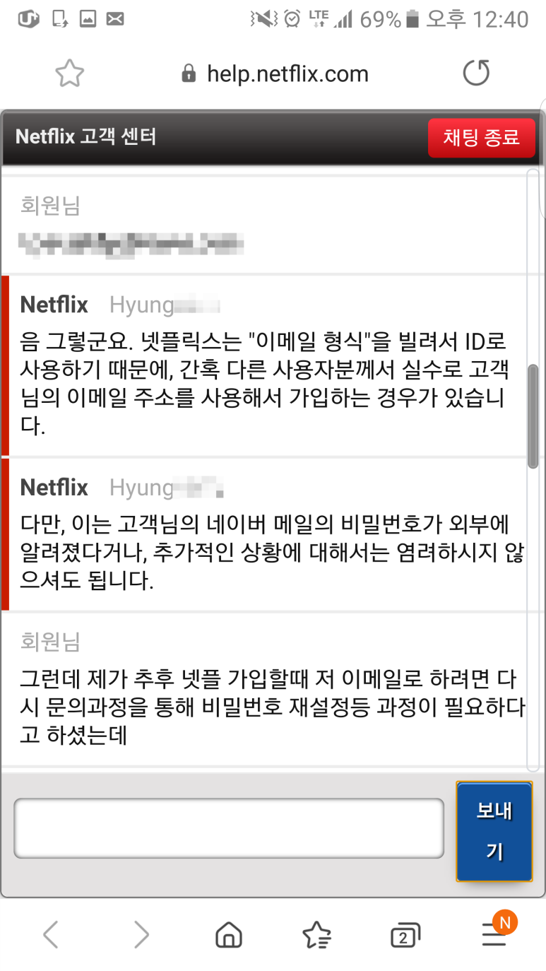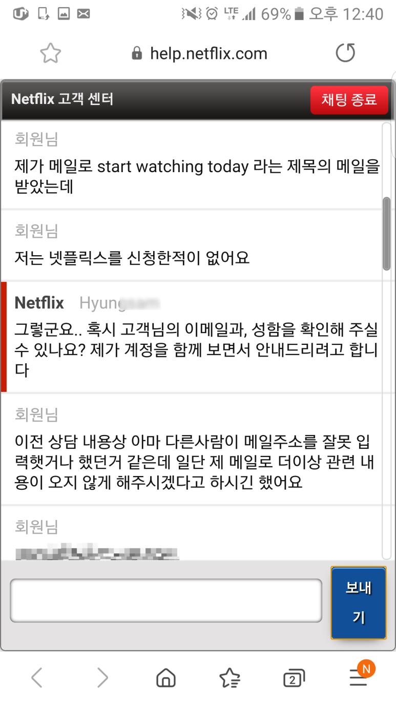 아무튼 최근 스팸메일은 다반사로 링크를 잘못 눌러 큰일이 날까봐 네이버 메인에 넷플릭스를 쳤다.그리고 고객센터로 전화하려는데 메신저 형식으로 진행이 되서