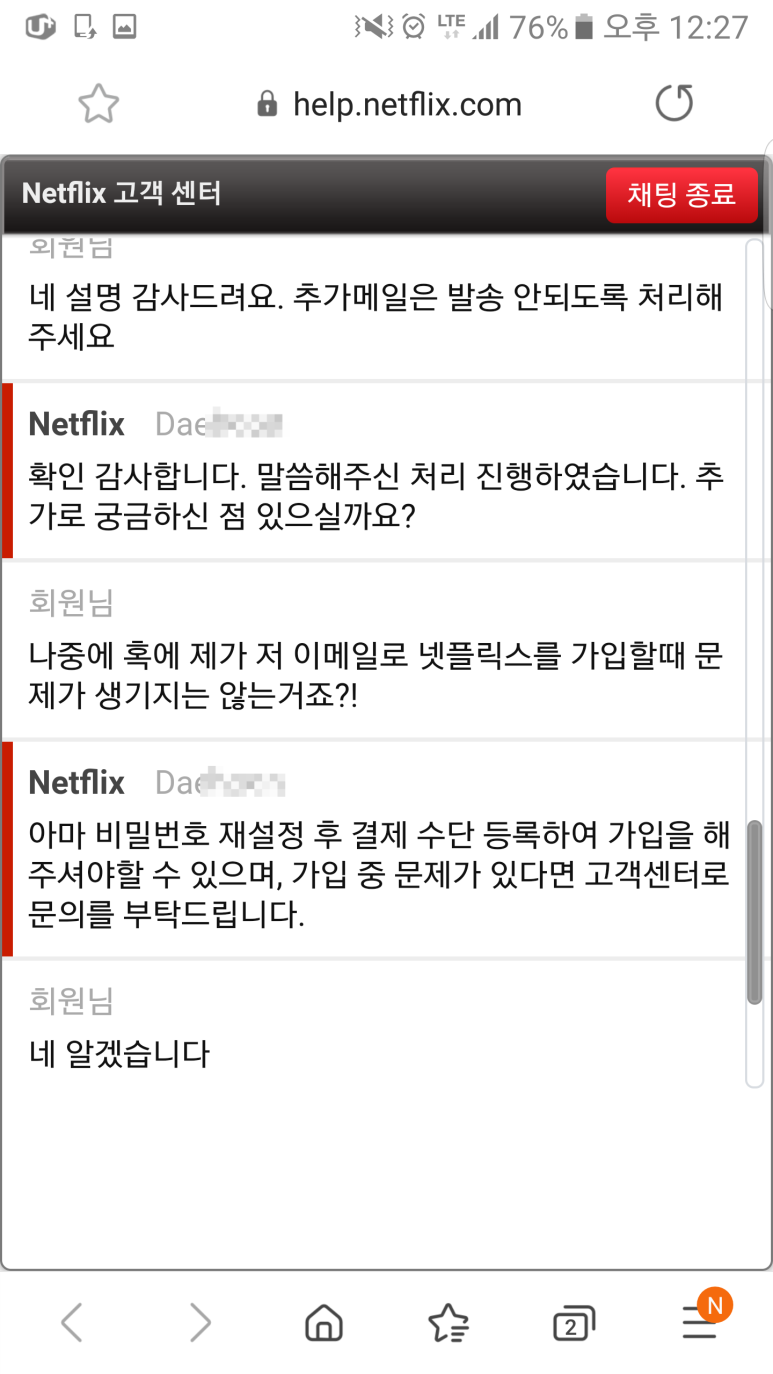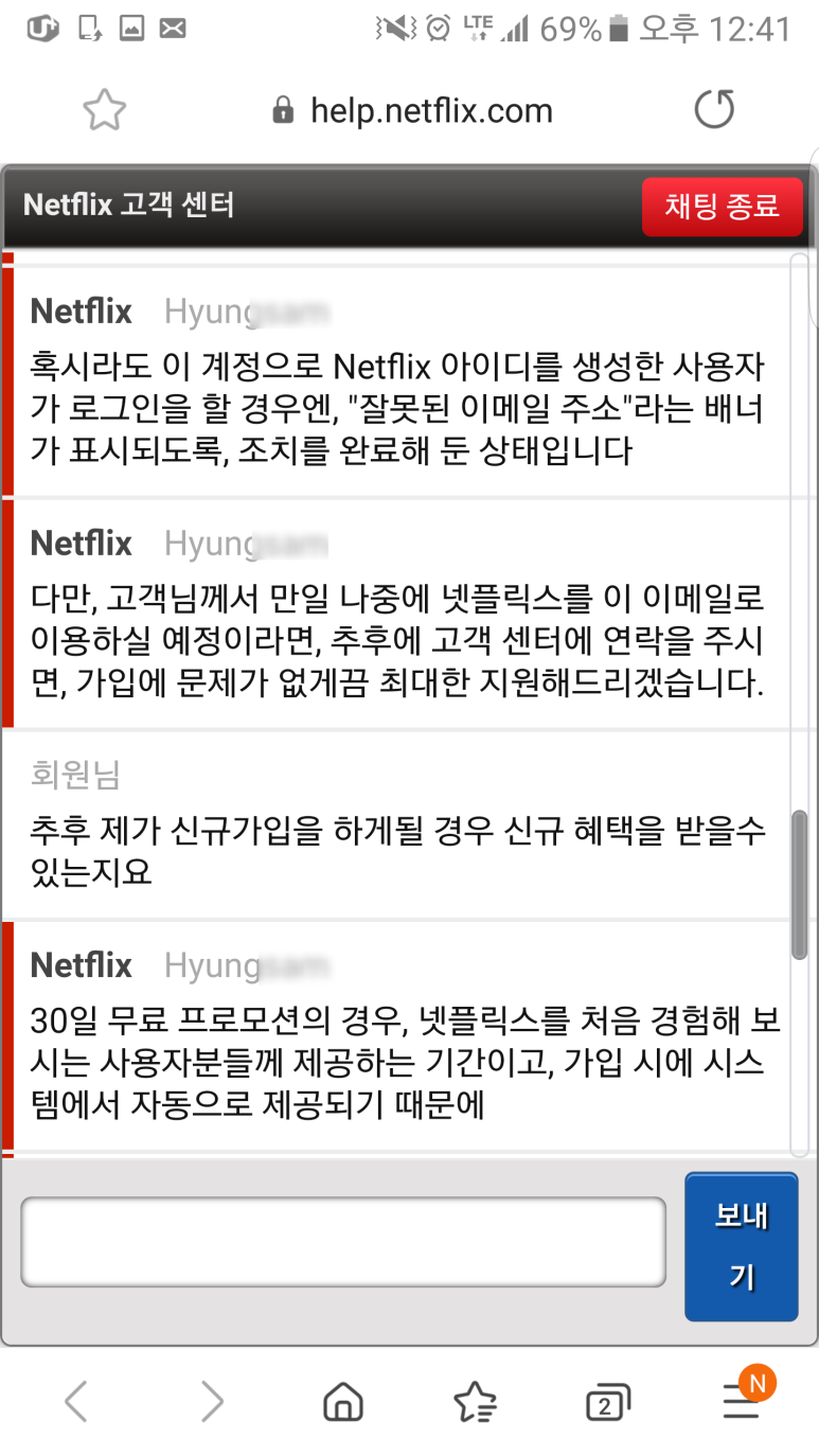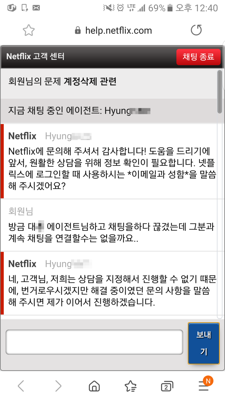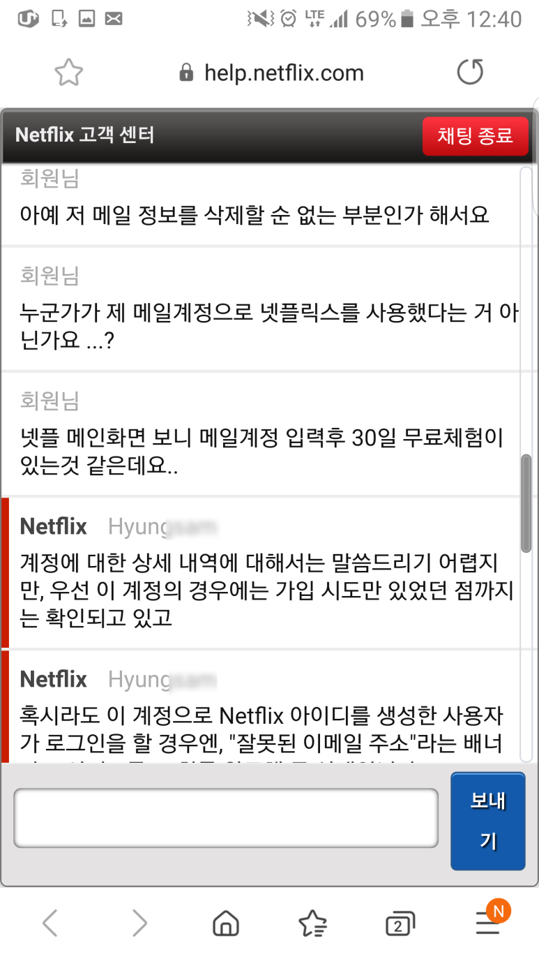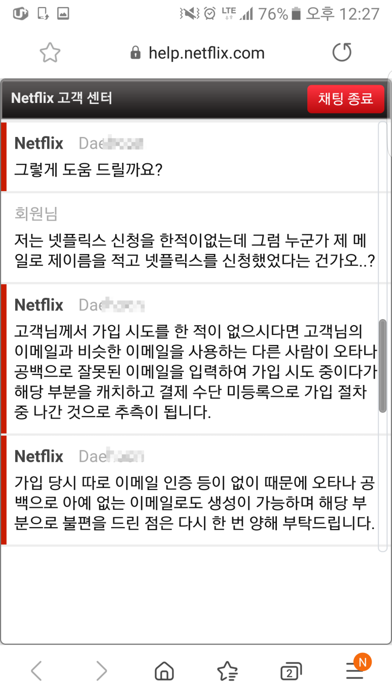 아무튼 최근 스팸메일은 다반사로 링크를 잘못 눌러 큰일이 날까봐 네이버 메인에 넷플릭스를 쳤다.그리고 고객센터로 전화하려는데 메신저 형식으로 진행이 되서