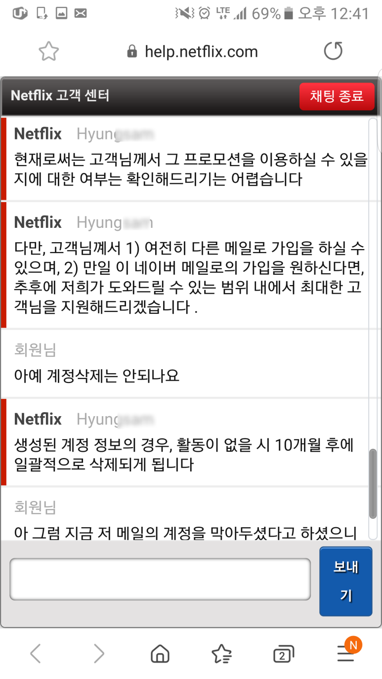 여기서 문제! 위에서 나를 응대한 내용은 1) 나는 다른 메일로 가입할 수 있고 2) 이메일로 가입을 원할 경우 고객센터로 전화하면 최대한 도움을 준다고 한다.3) 현재 도용으로 의심되는 계정은 사용하지 않을 경우 10개월 후 삭제된다.결론은 도용 당사자는 현재 당장 이용 가능한 넷플릭스 계정이 없다.그런데 10개월 동안 계정은 살아 있을 예정이다. 근데 이용할 수는 없어