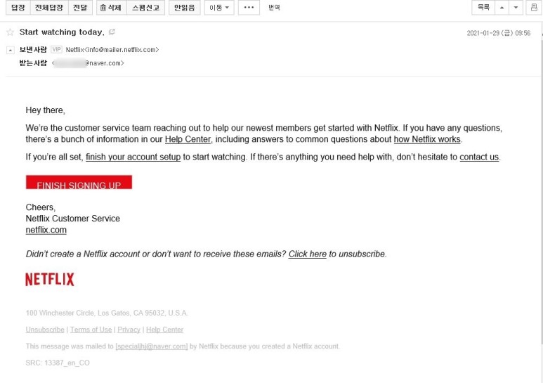 어쨌든 넷플릭스 고객센터에 e메일 도용 관련 문의를 했을 때 대*에이전트(상담사)와 나눈 내용을 요약하자면 1. 넷플릭스는 가입 당시 e메일 인증이 없고 어떤 조합이든 e메일 형식이라면 가입 가능하기 때문에 누군가 오타를 내거나 그대로 입력한 것이 하필 당신의 e메일 주소인 것 같다.2. 계좌연결을 하라는 문자를 받고 계좌연결을 안했으니 가입완료 되겠군3. 추가 메일을 받지 않게 해준다 4. 만약 넷플릭스에 가입하려면 비밀번호를 재설정한 뒤 결제수단을 등록해야 하며 문제가 생기면 고객센터로 다시 연락주세요라는 큰 틀에서 마무리!라고 생각하니 개운치 않았다.ㅎ