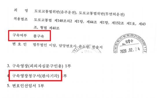 경찰 단계에서 불구속 의견으로 검찰에 사건을 송치했으나 담당 검사의 판단으로 기소 전에 구속영장을 청구해 재범 위험이 높은 점, 도주 우려가 농후한 점, 동종 범죄에 의한 집행유예 기간 중 반성하지 않은 점, 도로교통법 개정으로 법정형이 2년 이상 5년 이하 상향된 점, 동일 차량에서 반복적으로 음주운전을 한 점 등에서 준법의식이 약해 구속의 필요성이 있다.