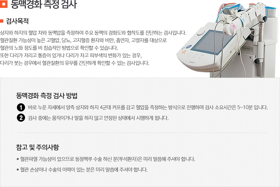 동맥 경화 검사 방법과 주의 타케우에 동맥 경화는 가장 무서운 질환의 하나로 혈관 내벽에 혈관이 형성되고 혈관이 좁아지고 동맥 경화는 뇌 혈관 질환이 발생합니다.이것은 트리글리세리드와 콜레스테롤이 혈관 내벽에 축적되며 혈관을 좁히며 경화시키는 상태입니다.튜브 지름이 50을 넘어 좁아지면 탄성이 감소합니다.타케우에 동맥 경화는 심근 경색이나 뇌 출혈 등 각종 합병증을 유발할 수 있고 적절한 관리가 필요합니다.건강 진단에서 열리는 동맥 경화 검사는 동맥의 탄력성을 측정하는 검사의 하나입니다.여기서 혈압은 사지의 여러 부분에 측정기를 달고 혈압을 측정하게, 사지의 혈관이 막혔는지를 판단할 수도 있습니다.엎드려서 편안하고 혈압을 감고 혈압과 혈류를 모니터링하는 방법입니다.짧은 시간이면 됩니다.혈관의 탄력성 등 동맥 경화 예측 검사 앞에는 단식 없이 복용하는 모든 약에 대해서 의료 제공자와 상담할 필요가 있습니다.고혈압이나 당뇨병 등 동맥 경화의 위험이 있는 경우는 정기 검진이 필요합니다.중년이면 동맥 경화로 적절하게 관리하는 것이 중요합니다.건강 진단은 국가 검진 센터에서 준비한 검진에서 건강 관리에 도움이 될 만큼 정기적으로 건강 진단을 받아 주세요.