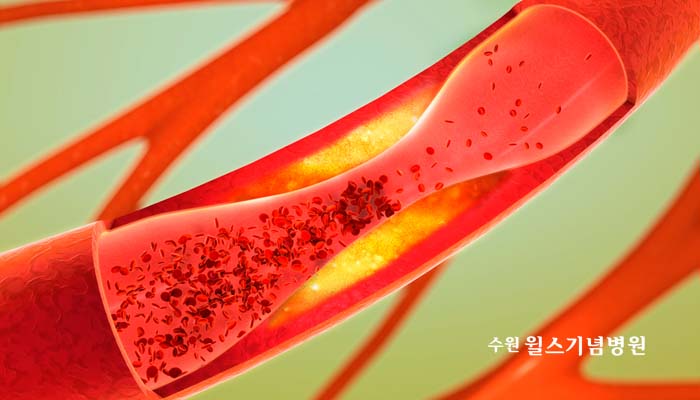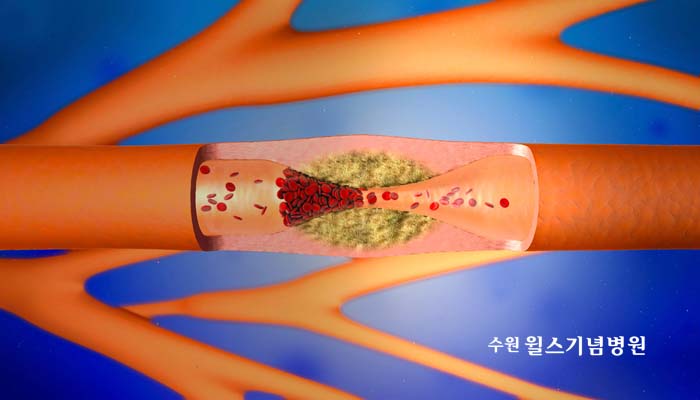 동맥경화증:동맥의 안쪽 내막에 콜레스테롤이나 중성지방이 쌓이면 혈관이 좁아져 아래쪽 혈관에 혈류장애가 발생합니다.