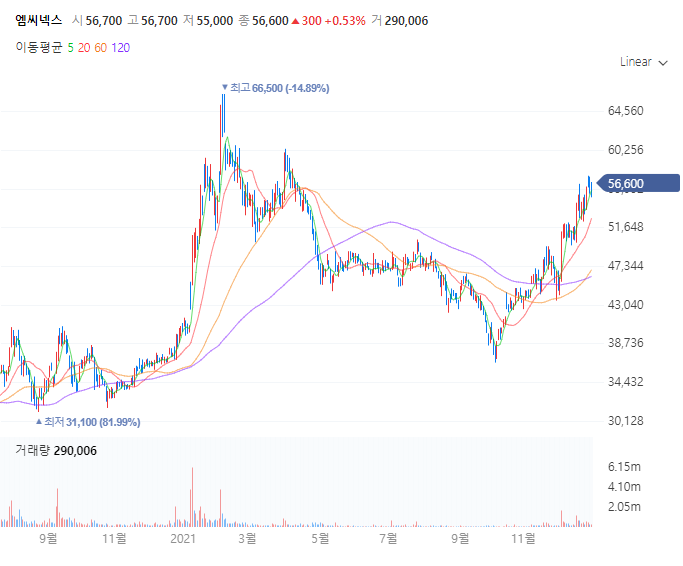 엠씨넥스는 올해 10월 이후 주가가 꾸준히 오른쪽 상단 방향으로 나아가고 있습니다.