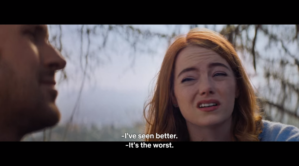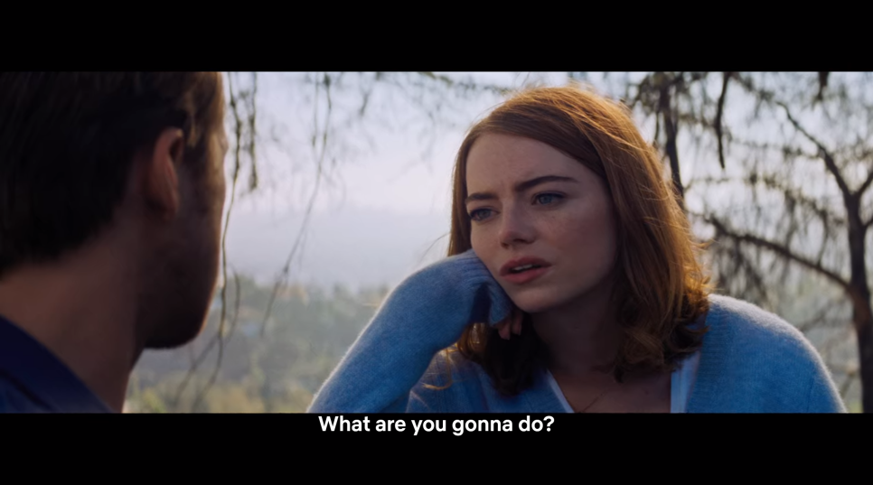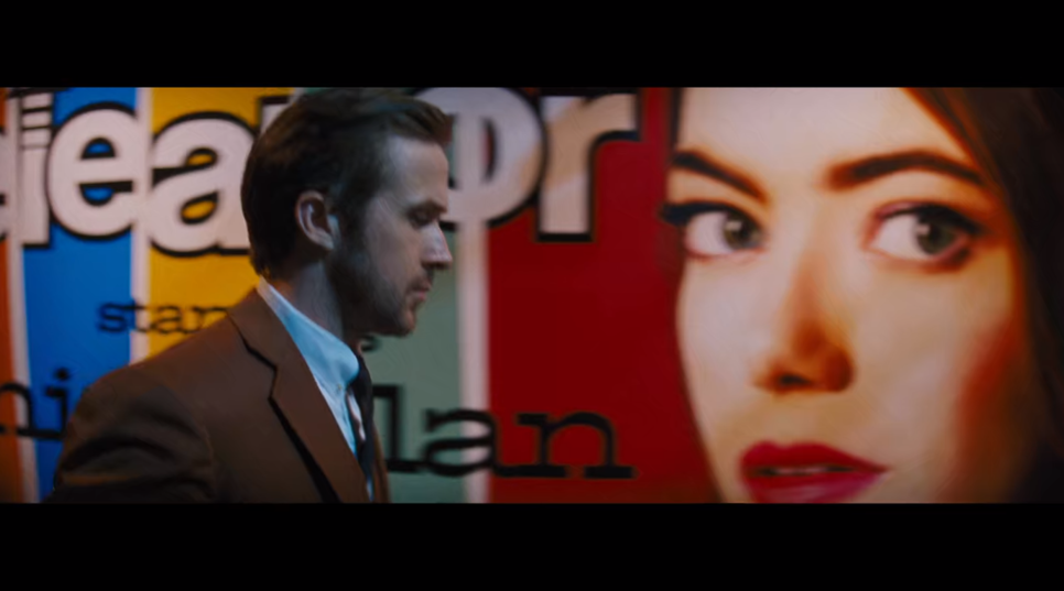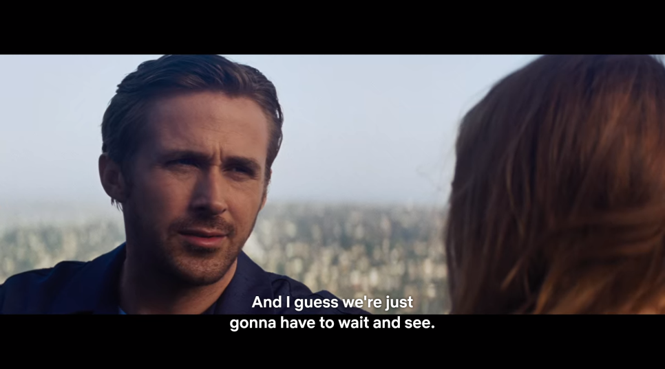 고슬링의 오른쪽 뺨이 살짝 떨리며 옅은 미소를 보여준다.그리고 엠마도 웃으며 서로 다시 헤어진다.이 부분은 정말 마지막까지 여운을 주는