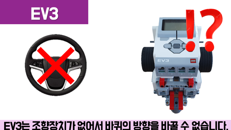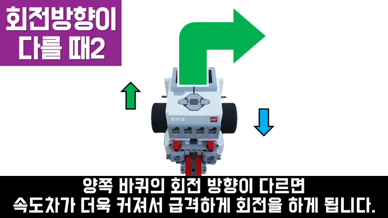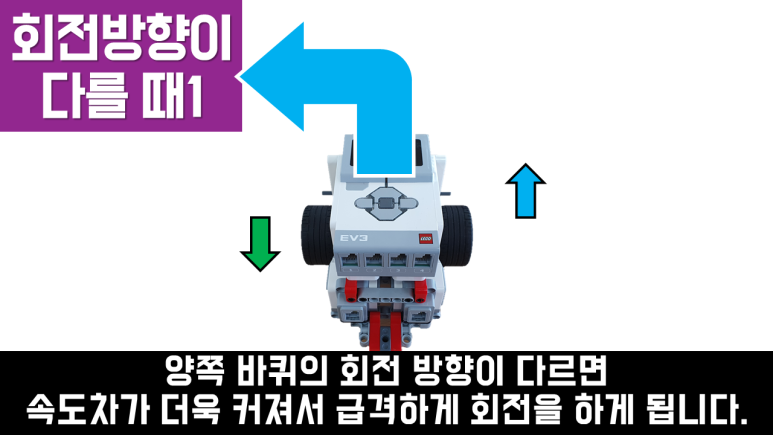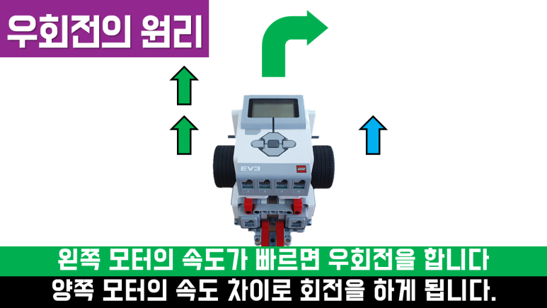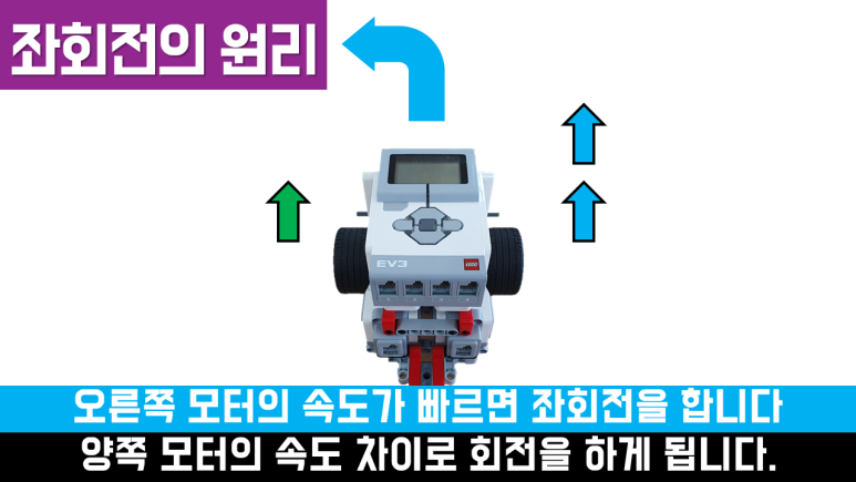 회전의 원리 실제 자동차가 회전할 때에는 조향장치를 이용하여 바퀴의 방향을 바꿉니다. 그러나 EV3를 포함한 대부분의 프로그래밍 교구에는 조향 장치가 없습니다. 따라서 바퀴의 방향을 바꾸지 않고 바퀴의 속도차로 회전합니다. 즉, 같은 시간에 다른 거리를 가야 하기 때문에 드라이빙 베이스가 한쪽으로 치우쳐 이동하게 됩니다. 속도가 느린 방향으로 회전을 합니다. 또한 양륜의 회전 방향이 다르면 속도의 차이가 더 커지고 회전을 더 급격하게 하게 됩니다.