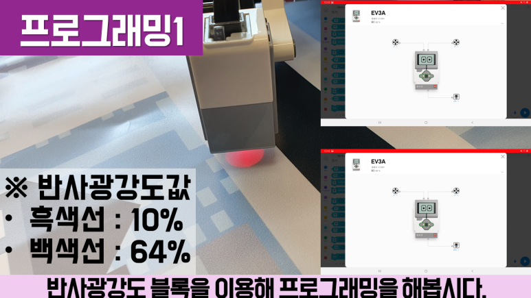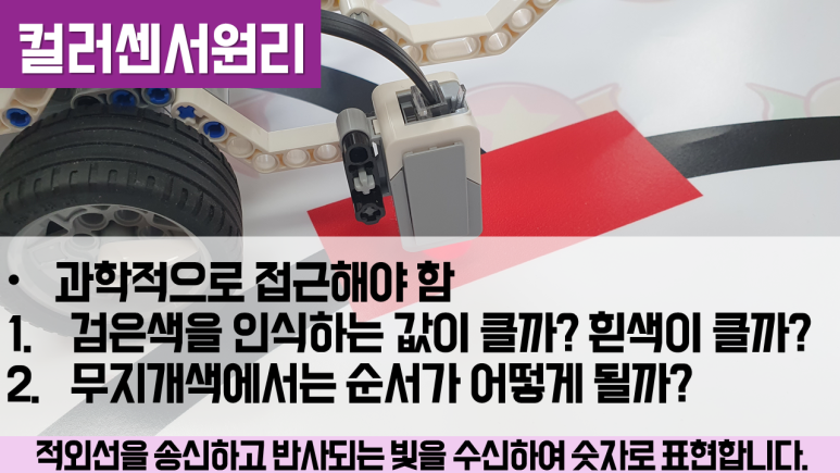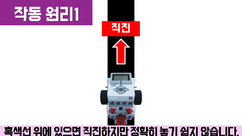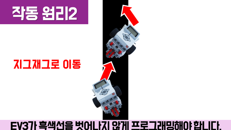 라인 트레이싱의 작동 원리인 라인 트레이싱은 검은 선이 늘어지지 않도록 하는 것이 중요합니다. 검은 선을 벗어나려면 반대 방향으로 주행시켜서 빠지지 않도록 해야 합니다. 또한 여기에서는 컬러 센서를 이용하여 프로그래밍하는데, 검은 선과 흰 선으로 반사되는 적외선의 차이를 이용하여 프로그래밍합니다.