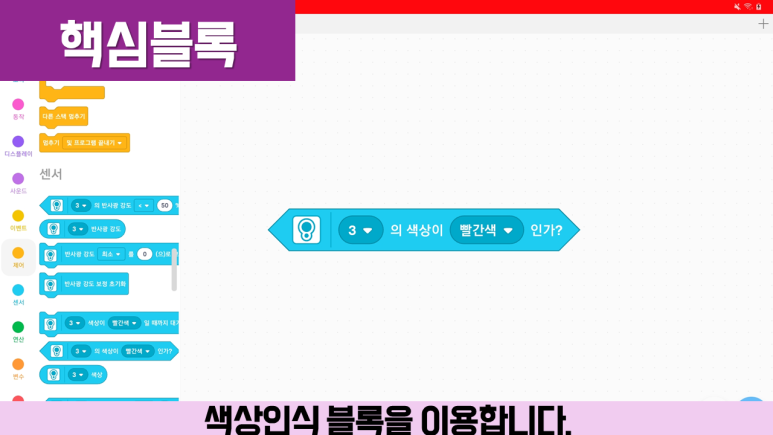컬러센서의 원리 콜레센서는 적외선을 송신하여 반사되는 적외선 값을 수신하게 됩니다. 모든 물체와 색은 반사되는 적외선의 값이 다르기 때문에 그 차이를 이용하여 색을 구별할 수 있습니다. 그리고 해당 센서 값은 EV3 CLASSROOM 프로그램의 화면 상단에 있는 값을 이용하여 확인하고 프로그래밍에도 이용합니다.