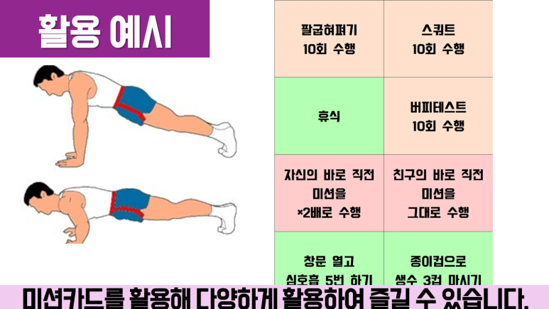 활용예로 여러 가지 방법으로 게임이나 놀이를 할 수 있습니다. 잡기나 놀이까지 프로그래밍을 할 경우에는 라인트레이싱으로 해당 목표에 도달한 후에 사탕이나 미션지를 가지고 와서 게임을 할 수 있습니다. 운동부족의 현대인들에게 운동할 수 있는 기회도 제공할 수 있습니다. 옆에 있는 친구들의 건강을 챙겨줄 수도 있습니다