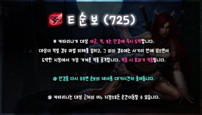 Q-E-W-평-미니언이나 아키노 대상으로 E: 단검 2개를 주우면 바로 E순보 쿨타임을 완전히 초기화시킬 수 있어 딜교 후 누락 및 아키노에 편리합니다.