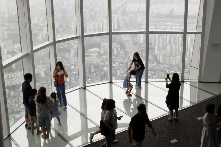 지난 9월 7일 캐나다 밴쿠버에 있는 손자가 방학을 기해 외가로 오면서 아들 부부와 함께 롯데타워 구경을 갔다. 언제 한번 가보려던 소원을 풀었다. 건물 외부는 지나가면서 수박 겉열쇠로 여러 차례 봤지만 건물 안으로 들어가 보기는 처음이다. 주차장에서 여기저기 바빠 엘리베이터는 어디서 타야 하는지 시골 사람들은 그저 어리둥절하기만 했다. 고속 엘리베이터로 순식간에 전망대까지 올라간다.