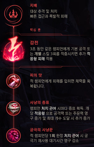 첫째, 감전·포식자 중 선택해 주십시오.감전은 3타 적중 시 추가 피해가 발생하지만, 포식자는 빠른 속도로 E 스킬을 적중시킬 수 있는 장점이 있습니다.