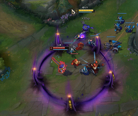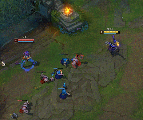 베이는 한 타, 특히 E 스킬이면 빠져나갈 수 있는 스킬이 적기 때문에 한 타 때 잘 닫기만 하면 깜빡거리거나 확정 킬이 나올 수 있어 아주 좋은 챔피언입니다.