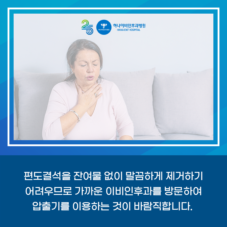 간혹 편도결석 발생 위치가 외부에 노출되어 있을 경우 집에서 편도결석 제거를 시도하시는 분들이 계시는데요. 혼자서 손이나 면봉으로 편도 결석 제거를 시도할 경우 구강이나 편도를 다칠 수 있습니다. 출혈이 있을 경우 2차 감염의 위험이 있습니다. 또한 편도 결석을 남기지 않아 깨끗하게 제거가 어렵기 때문에 가까운 이비인후과에 가서 압출기를 이용하는 것이 좋습니다.
